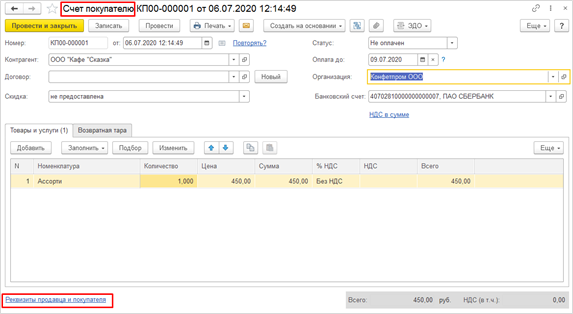Для того, чтобы выбрать или изменить дополнительные условия, необходимо открыть программу в режиме «Предприятия» и перейти, непосредственно, в документ «Счет покупателю» и в нижнем левом углу найти ссылку «Реквизиты продавца и покупателя» и нажать на нее.
