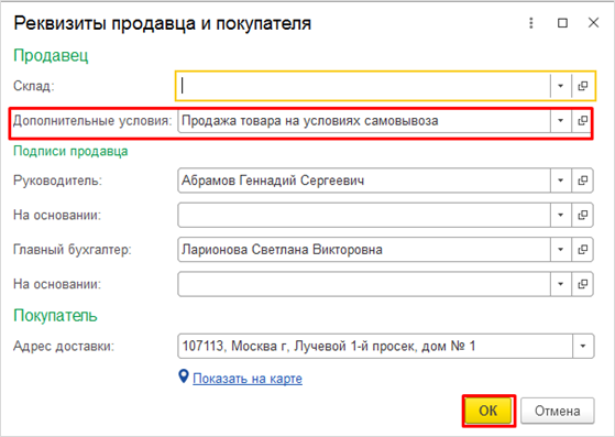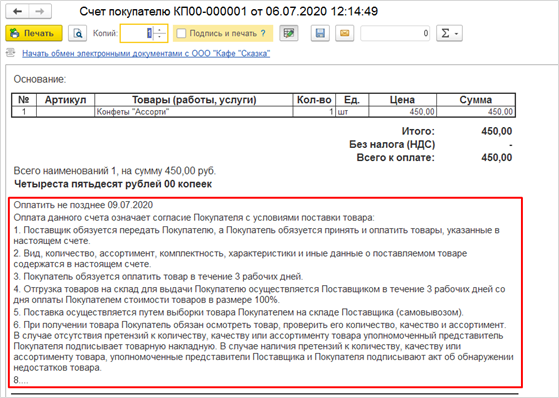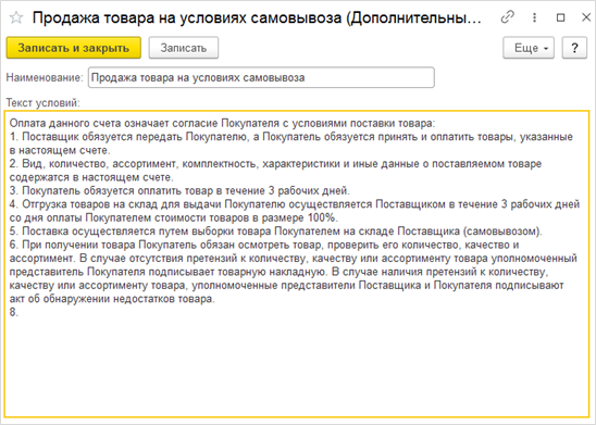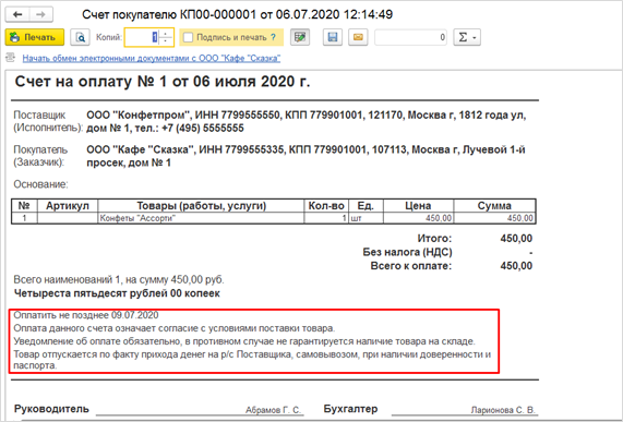 При формировании печатной формы счета на оплату покупателю может появиться необходимость изменить данные по условиям отгрузки и оплаты. Такая возможность в программе 1С реализована, настроить можно это без каких- либо доработок и редактирования макета.