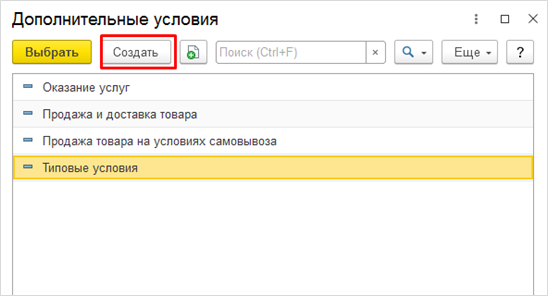 После выполненных действий, необходимо выделить поле «Дополнительные условия», из которого можно открыть список стандартных шаблонов дополнительных условий и выбрать один из вариантов.