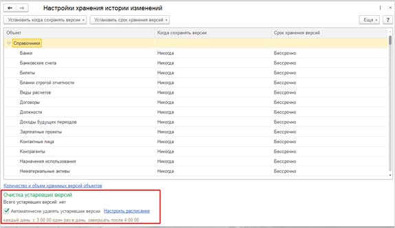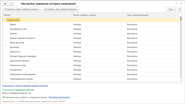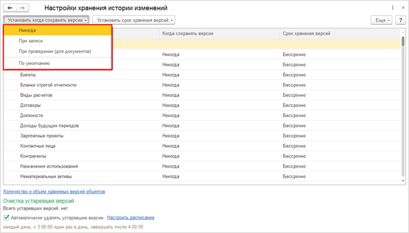 Используя кнопку «Установить когда сохранять версии» можно задать параметр, в какой момент нужно сохранять версию – «Никогда», «При записи», «При проведении» или «По умолчанию». Настройка «По умолчанию» предполагает рекомендуемые настройки: для справочников – «Никогда» не создавать версии, для документов – «Создавать версии при проведении».