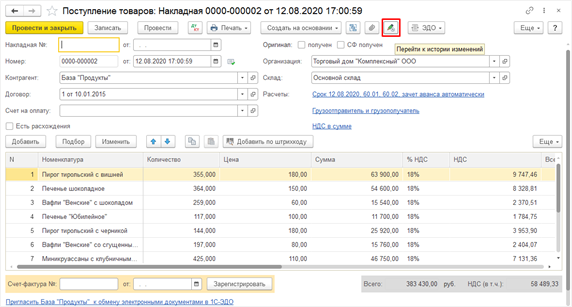 После того, как для объектов будут заданы все параметры сохранения версий, появится дополнительный пункт в меню – «История изменений», который можно будет открыть из панели инструментов «Перейти к истории изменений» либо по кнопке «Еще» в журнале документов.