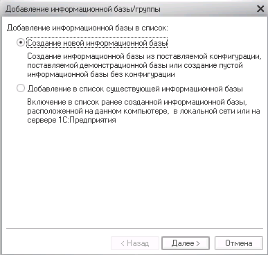 При выборе варианта "Создание новой информационной базы" нажимаем кнопку Далее и переходим к пункту 3. При выборе "Добавление в список существующей информационной базы" нажимаем кнопку Далее и переходим сразу к пункту 4.