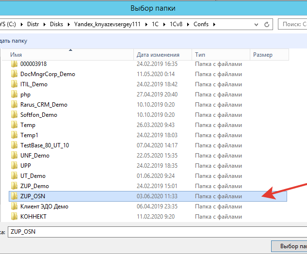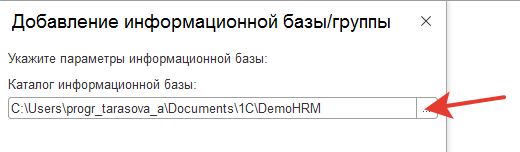 Чтобы указать путь на диске к информационной базе, нажимаем на кнопку "..." (где указана стрелочкой). В появившемся окне выбираем (если папка отсутствует, создайте ее) и становимся на нужную папку (стрелочка 1):