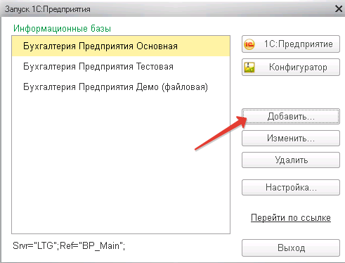 1) Запускаем ярлык 1С. В списке баз необходимо нажать кнопку "Добавить":