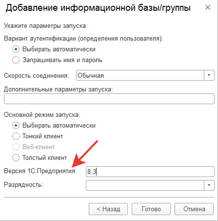 Здесь как правило ничего менять без надобности не нужно, можно нажимать кнопку Готово. Но иногда необходимо указать, под какой версией запускать добавляемую информационную базу. Вы можете указать здесь и 7.7, и 8.1, и 8.2, и 8.3. В зависимости от указанной платформы, и при наличии ее установки на компьютере, база запустится под этой платформой. По умолчанию всегда предлагается запуск под самой актуальной версией платформы - 8.3.