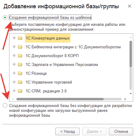 Необходимо выбрать установленные ранее базы (первая стрелочка), либо выбрать "Создание инф.базы без конфигурации" (вторая красная стрелочка). Бухгалтеру как правило нужен всегда первый вариант.
