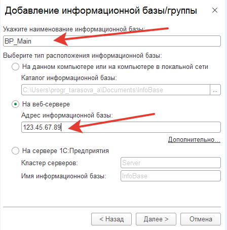 Здесь необходимо в поле адреса информационной базы указать полную строку соединения с веб-сервером, состоящую из адреса (в данном примере адрес:123.45.67.89) и имени базы (в данном примере BP_Main). (примечание для бухгалтера: эти данные необходимо узнать у администратора сети или программиста 1С). После указания параметров нажимаем Далее, и в следующем окне также нажимаем Далее.