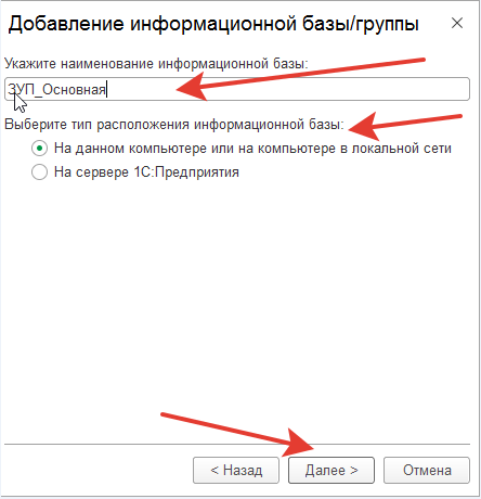 Примечание. Если в пункте 2 вы выбрали "Создание новой информационной базы", в данном пункте опция "На вебсервере" будет недоступна (т.к. нельзя добавить базу на веб-сервере прямо со своего компьютера).