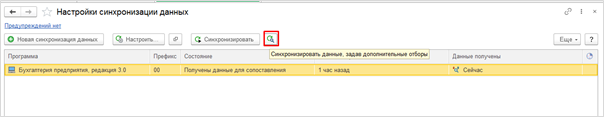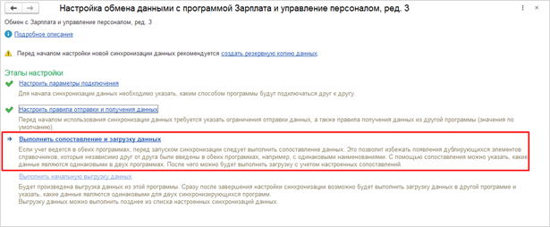 По результатам успешного выполнения последнего этапа настройки синхронизации переходим в программу Зарплата и управление персоналом и нажимаем на кнопку «Синхронизировать данные, задав доп. параметры». Сопоставление производится аналогичным образом.