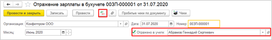 Но этих настроек также недостаточно для формирования проводок. Для того, чтобы все же сформировались движения по «Отражению зарплаты в бухучете», необходимо открыть данный документ из раздела «Зарплата и кадры» и установить отметку «Отражено в учете», после этого его провести. После выполненных действий проводки будут сформированы.