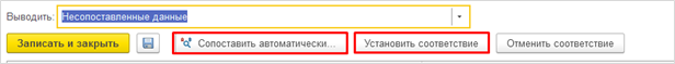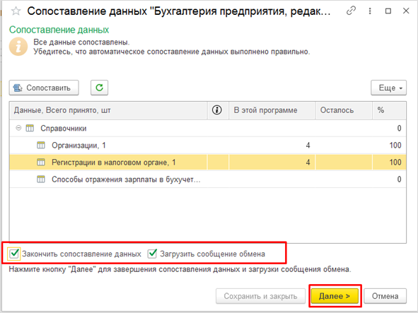 Если же в данной колонке указано количество не сопоставленных элементов, то необходимо установить соответствие по кнопке «Сопоставить». В открывшейся форме сверить данные, если не сопоставились одинаковые объекты, то нажать на кнопку «Установить соответствие» либо «Сопоставить автоматически» и задать параметр для сопоставления. Для того, чтобы закончить сопоставление и перейти к следующему этапу, необходимо установить флажки «Закончить сопоставление объектов» и «Загрузить сообщение обмена», нажать кнопку «Далее».