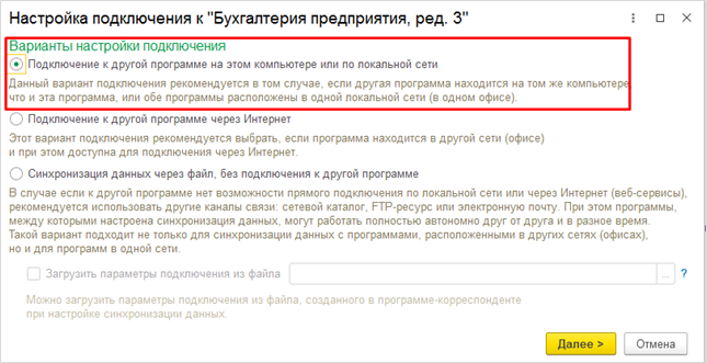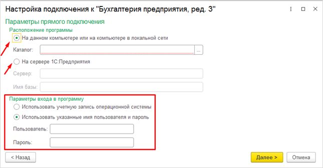 В открывшемся окне необходимо выбрать один из подходящих вариантов. Если информационная база расположена на данном компьютере или компьютере в локальной сети, установить первый флажок.