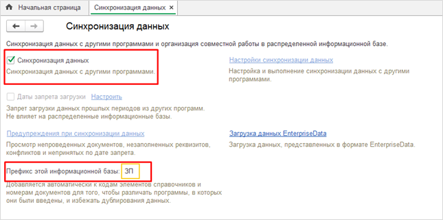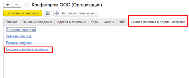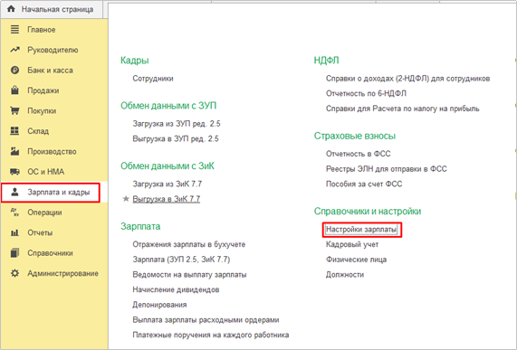 Такие настройки надо установить в двух программах. Настройку в данном примере начинаем со стороны программы «Зарплата и управление персоналом».