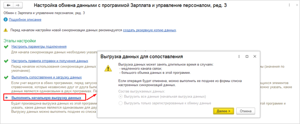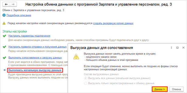 Далее переходим к выполнению следующего этапа «Выполнить начальную выгрузку данных», в этом случае идет выгрузка данных для сопоставления.