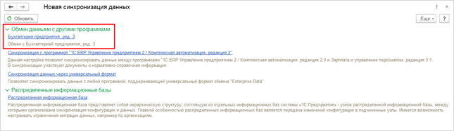 В открывшемся окне следует нажать на кнопку «Новая синхронизация данных» и выбрать вариант «Бухгалтерия предприятия, ред. 3».