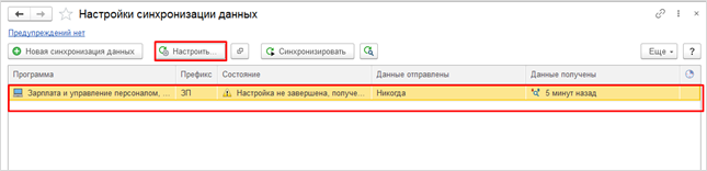 Все этапы настройки синхронизации в программе «Зарплата и управление персоналом» выполнены. Переходим в программу Бухгалтерия, открываем раздел «Администрирование» - «Синхронизация данных» - «Настройка синхронизации данных». Настройка обмена создалась автоматически, осталось только выполнить этапы настройки, нажав на кнопку «Настроить».