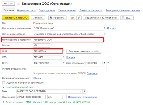 Открыв реквизиты организации, необходимо проверить, соответствуют ли «Наименование в программе» в бухгалтерской программе и «Краткое наименование» в «Зарплате и управление персоналом», а также идентичность ИНН.