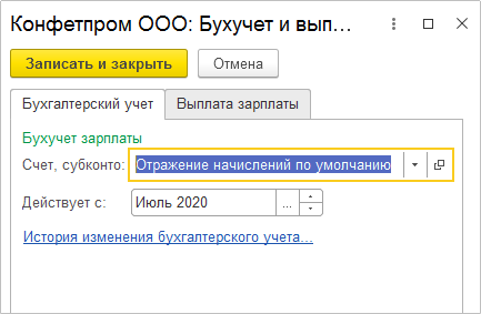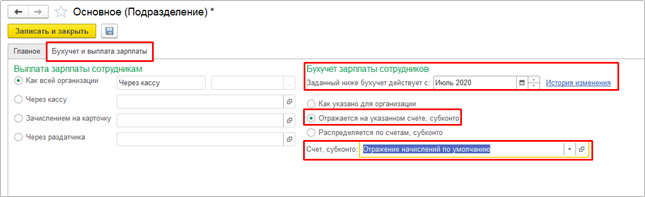 Либо из раздела «Настройки», далее «Подразделения» - «Бухучет и выплата зарплаты», выбрать «Отражается на указанном счете, субконто», заполнить «Счет, субконто» и с какого периода действует.