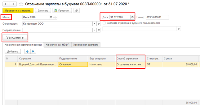 В открывшемся окне нужно выбрать организацию (если их несколько в программе), подразделение (это необязательно, задается, если нужно сформировать документ конкретно по нему), месяц начисления, установить дату (как правило, это последнее число месяца) и после этого нажать на кнопку «Заполнить», документ заполнится по всем выполненным начислениям за месяц. Обратите внимание на то, чтобы в колонке «Способ отражения» было указано конкретное значение, т.к. оно влияет на формирование проводок по дебету.
