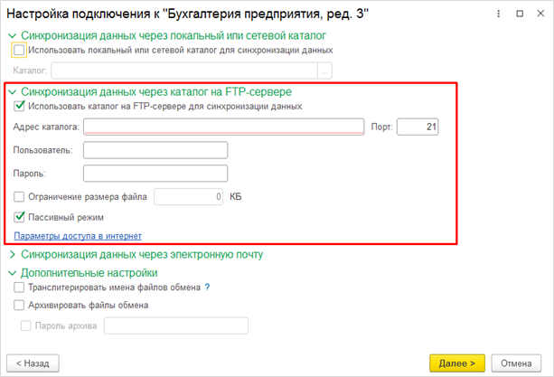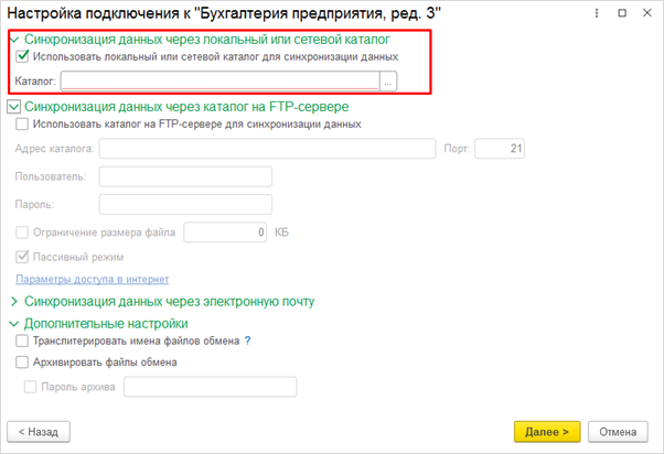 В открывшемся окне необходимо выбрать один из подходящих вариантов: «Синхронизация данных через локальный или сетевой каталог» или «Синхронизация данных через FTP-ресурс». Если обе базы локальные, то в обмене будет участвовать локальный каталог, и в этом случае создается папка на компьютере, доступная для двух информационных баз. Если же одна база серверная, другая локальная, или обе базы серверные без возможности использовать прямое подключение, то для запроса данных по сетевому каталогу или FTP-ресурс необходимо обратиться к системному администратору.