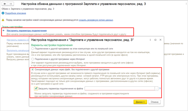 После этого требуется перейти по первой ссылке «Настроить параметры подключения» и выбрать вариант подключения «Синхронизация данных через файл, без подключения к другой программе» и нажать на кнопку «Далее».
