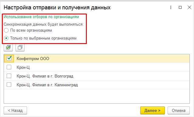 Далее, нужно выбрать, как будет выполняться выгрузка: «По всем организациям» или «Только по выбранным».