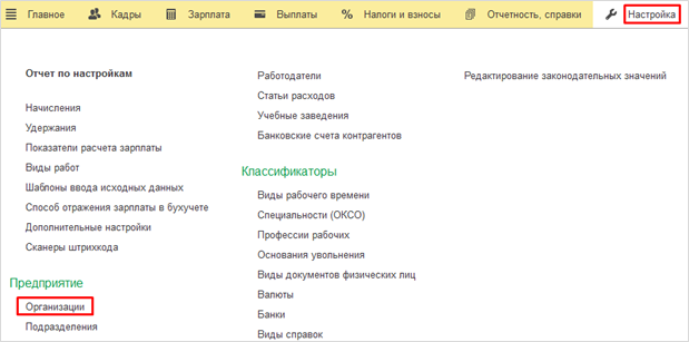 В программе «Зарплата и управление персоналом» (3.1) данные по организации находятся в разделе «Настройка» - «Организации» либо «Реквизиты организации».