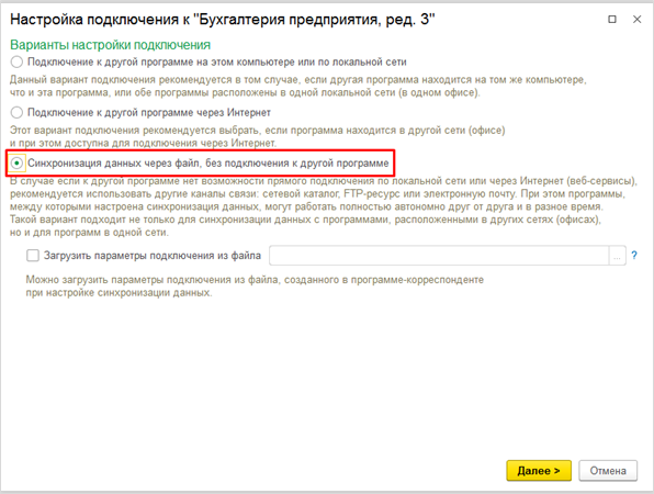 После этого требуется перейти по первой ссылке «Настроить параметры подключения» и выбрать вариант подключения «Синхронизация данных через файл, без подключения к другой программе» и нажать на кнопку «Далее».