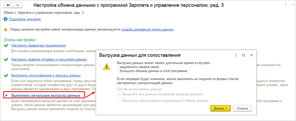 После выполненных действий приступаем к завершению настройки синхронизации со стороны Бухгалтерии и запускаем этап, на котором осуществляется выгрузка данных для программы Зарплата и управление персоналом.
