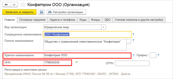 Открыв реквизиты организации, необходимо проверить, соответствуют ли «Наименование в программе» в бухгалтерской программе и «Краткое наименование» в «Зарплате и управление персоналом», а также идентичность ИНН.