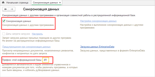 Для того, чтобы установить префикс, необходимо перейти в раздел «Администрирование»- «Синхронизация данных», далее «Префикс этой информационной базы». Здесь же ставим отметку «Синхронизация данных с другими программами».