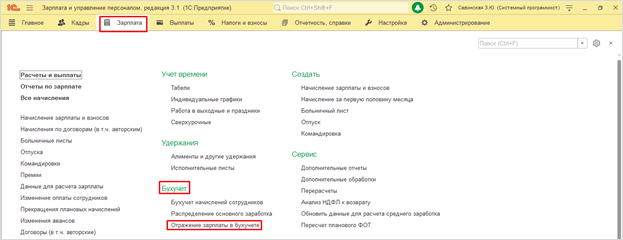 Документ «Отражение зарплаты в бухучете» формируется в разделе «Зарплата» - «Бухучет» - «Отражение зарплаты в бухучете», по кнопке «Создать».