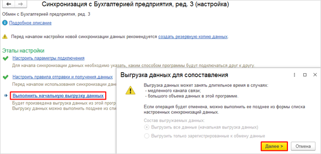 Далее переходим к выполнению следующего этапа « Выполнить начальную выгрузку данных», в этом случае идет выгрузка данных для сопоставления.