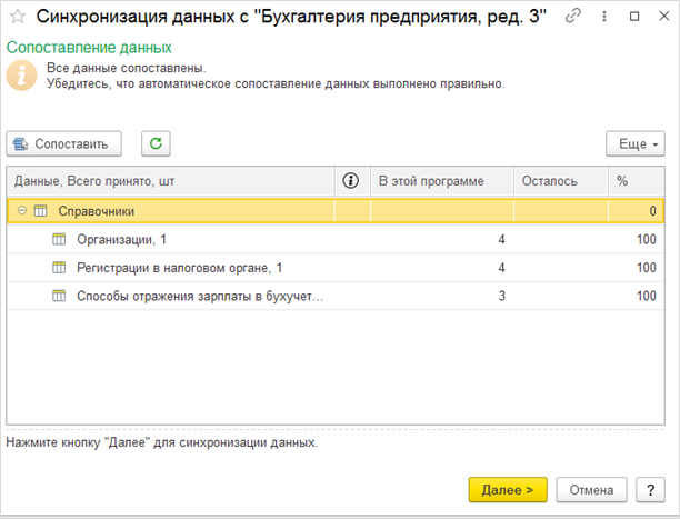 В открывшемся окне необходимо перейти по ссылке "Настроить параметры подключения" и установить вариант настройки «Синхронизация данных через файл без подключения к другой программе», далее выбрать из каталога сохраненные ранее настройки. После этого все этапы выполняете последовательно, заполняя все параметры, аналогично зарплатной программы. При запуске этапа «Выполнить сопоставление и загрузку данных» должно открыться окно «Сопоставление данных». Если данные в обеих программах указаны идентично, то в колонке «Осталось» будет пусто. Это значит, что данные в базах успешно сопоставились автоматически, можно установить флажок «Закончить сопоставление данных».
