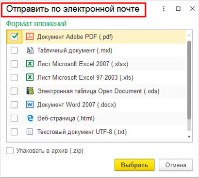 При успешной проверке станет доступна отправка писем из 1С. Отправить тот или иной документ из программы 1С, необходимо открыть список документ, сам документ или сформировать печатную форму и нажать на специальную кнопку в виде желтого конверта и выбрать формат отправляемого вложения.