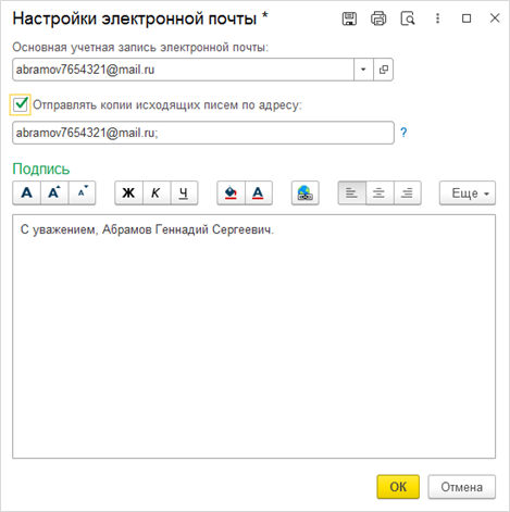 Также в программе можно настроить подпись для отправки электронного письма, сделать учетную запись основной, а так указать адрес для отправки копии писем. Для этого необходимо перейти в раздел «Главное» - «Персональные настройки», выбрать ссылку «Настройки электронной почты».