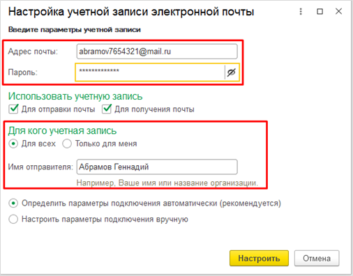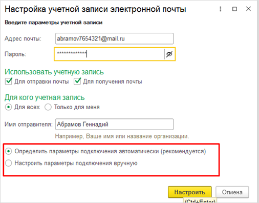 Также существует два варианта настройки подключения электронной почты: автоматический и ручной.
