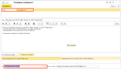Если в карточке контрагента (получателя) указан электронный адрес, то при отправке документа, он будет подставляться автоматически, если не указан, то его можно задать вручную.