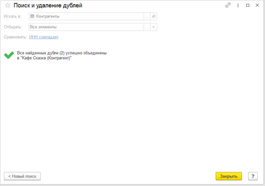 После выполнения вышеуказанных действий необходимо нажать на кнопку «Удалить дубли», чтобы программа объединила элементы и выполнила перенос связанных объектов, а также установила пометку на удаление на дублирующийся элемент.