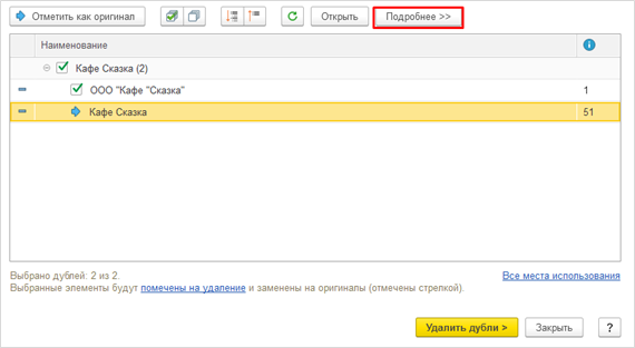 Элемент, у которого будет больше связанных объектов, автоматически будет отмечен как оригинал и все ссылки будут перенесены на него. Если оригиналом должен быть другой элемент, то его можно поменять по кнопке «Отметить как оригинал».