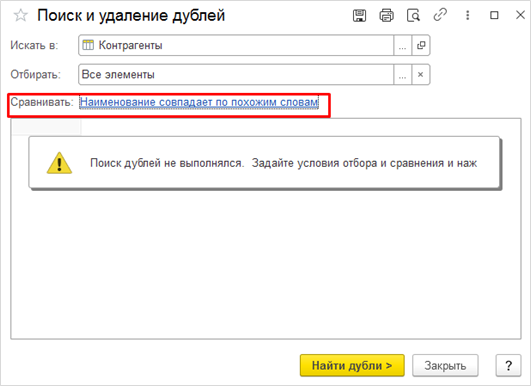 В поле «Сравнивать», нажав на ссылку, необходимо указать параметры поиска данных, а именно, по какому реквизиту программа будет считать элементы дублями.