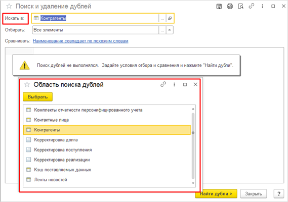 Далее открывается непосредственно сама обработка. В поле «Искать в» необходимо выбрать элемент для поиска, это может быть вид документа или справочник.