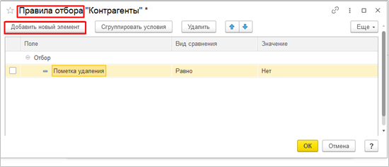 После того, как был выбран элемент для поиска, в поле «Отбирать» можно задать условия отбора дублирующихся элементов. Для этого следует нажать на кнопку «Выбрать» или клавишу «F4» и в открывшейся форме «Правила отбора», нажать на кнопку «Добавить новый элемент», далее задать соответствующие данные.