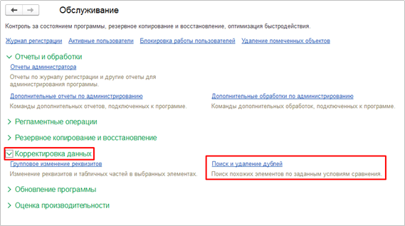 В открывшемся окне необходимо выбрать блок «Корректировка данных», после этого - «Поиск и удаление дублей».