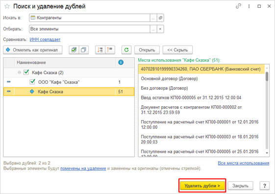 После выполнения вышеуказанных действий необходимо нажать на кнопку «Удалить дубли», чтобы программа объединила элементы и выполнила перенос связанных объектов, а также установила пометку на удаление на дублирующийся элемент.