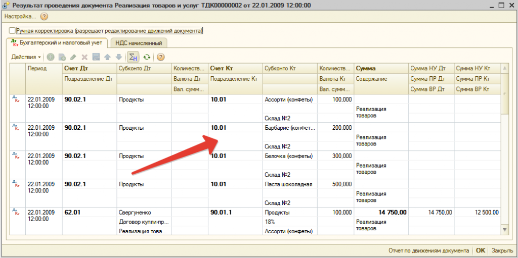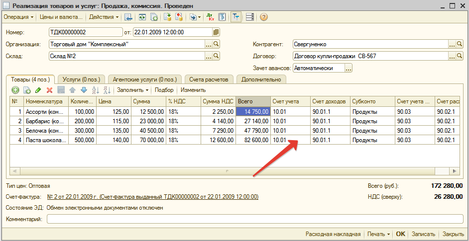 После выполнения обработки во всех документах «Реализация товаров и услуг», в табличной части «Товара» счет учета станет «10.01»