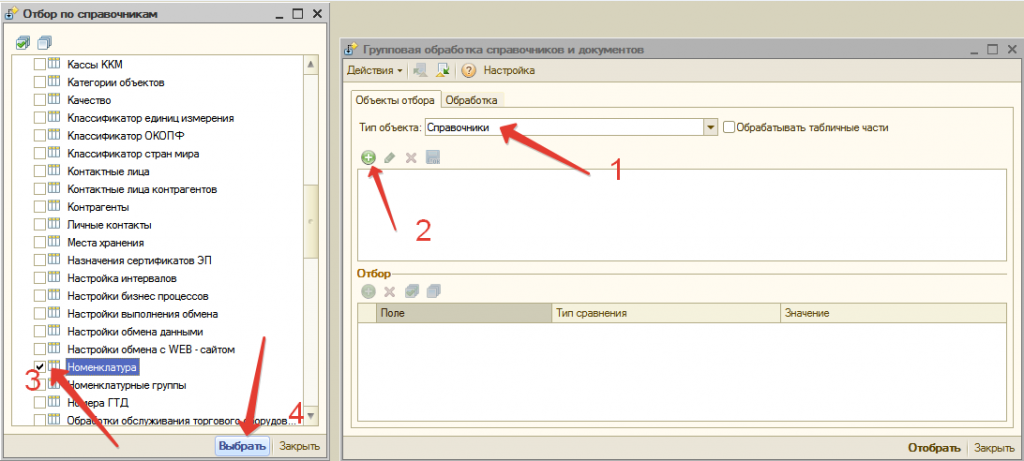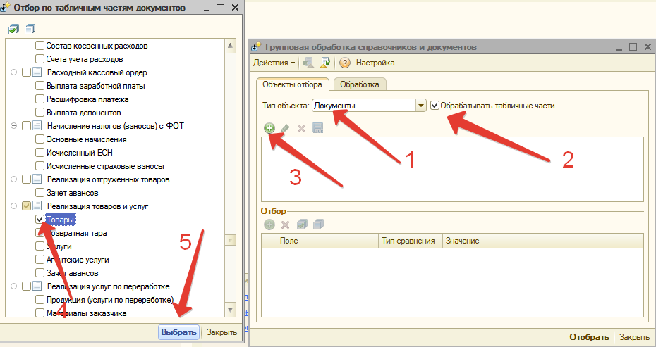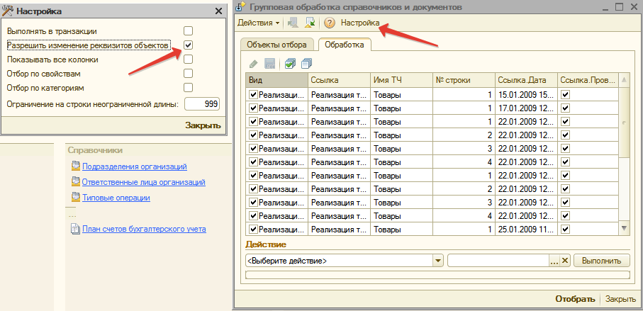 - Обрабатывать табличные части – флажок определяет возможность обрабатывать табличные части справочников и документов