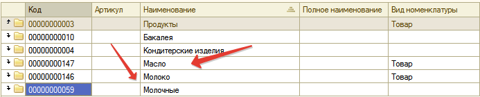 Пример 1. Требуется из группы номенклатуры «Молочные» перенести все молоко (номенклатуру, содержащую в названии слово «молоко») в отдельную группу «Молоко» и аналогично масло (номенклатуру, содержащую в названии слово «масло») в отдельную группу «Масло» (рис. 5, рис. 6)