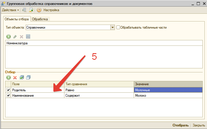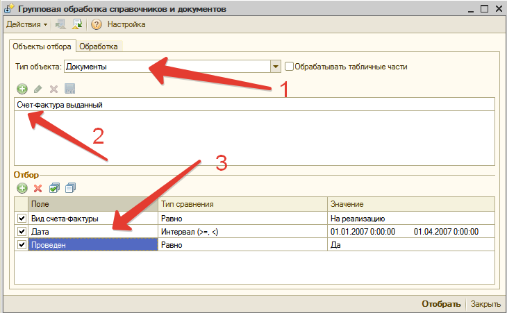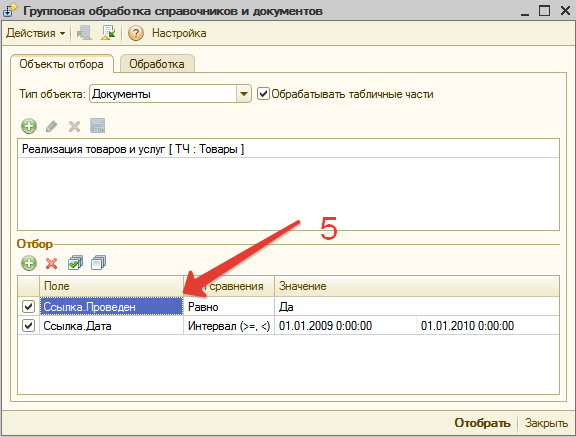 На первой панели «Объекты отбора» обработки заполняются следующие данные (рис. 2):