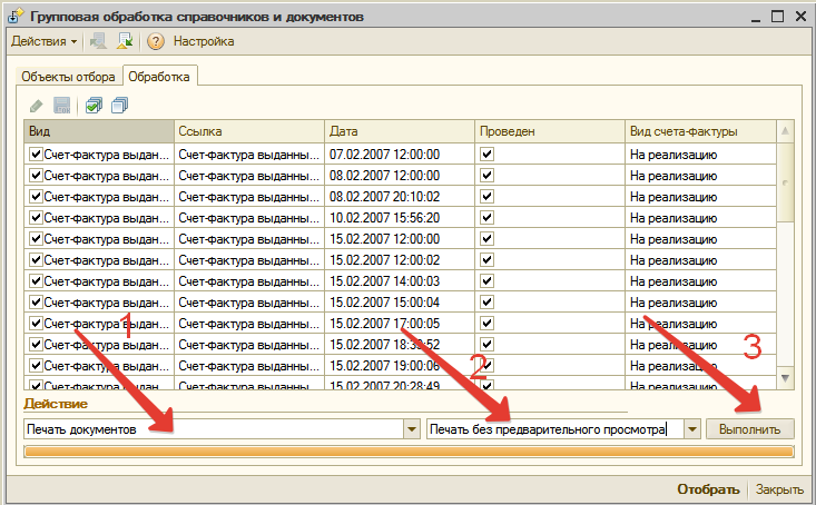 Нажмем кнопку «Отобрать» и на закладке «Обработка» выберем действие «Печать документов» и значение «Печать без предварительного просмотра» (рис. 12).